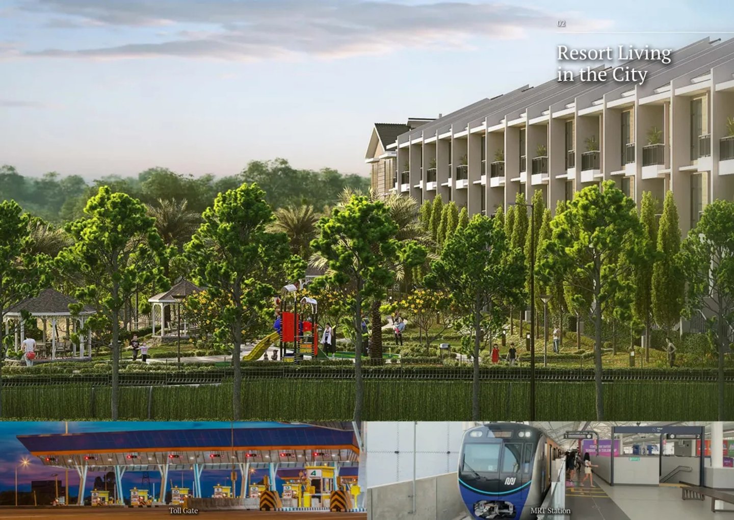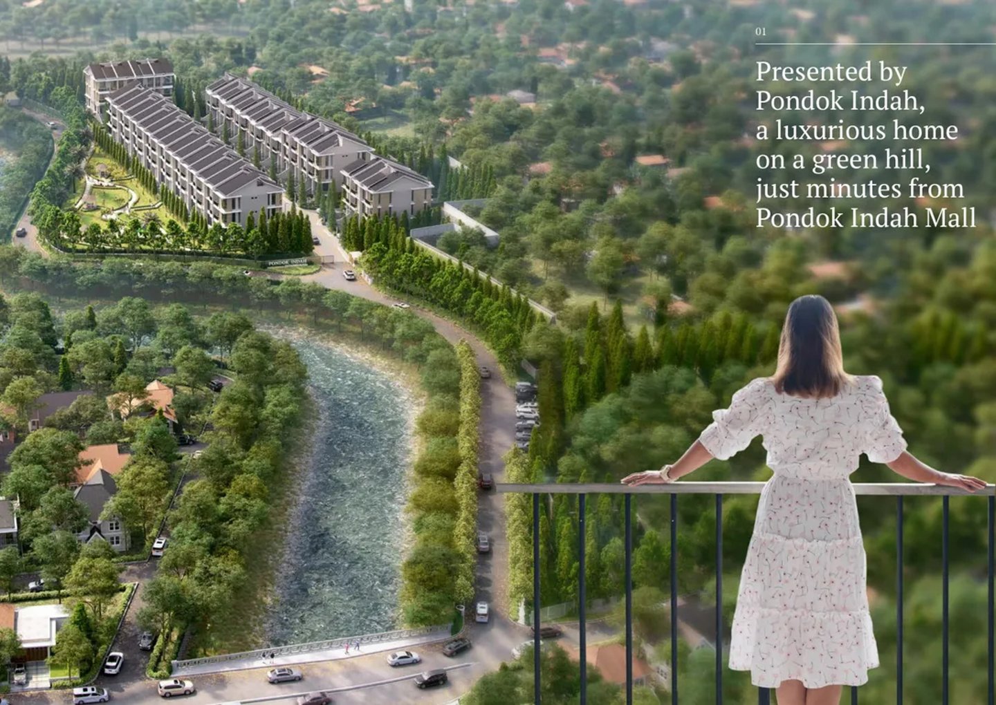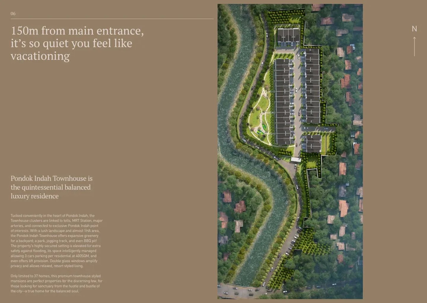 Penghuni dapat menikmati taman yang luas, lintasan joging, dan pemandangan tepi sungai. Rumah kota ini menggunakan sistem satu gerbang dengan keamanan
