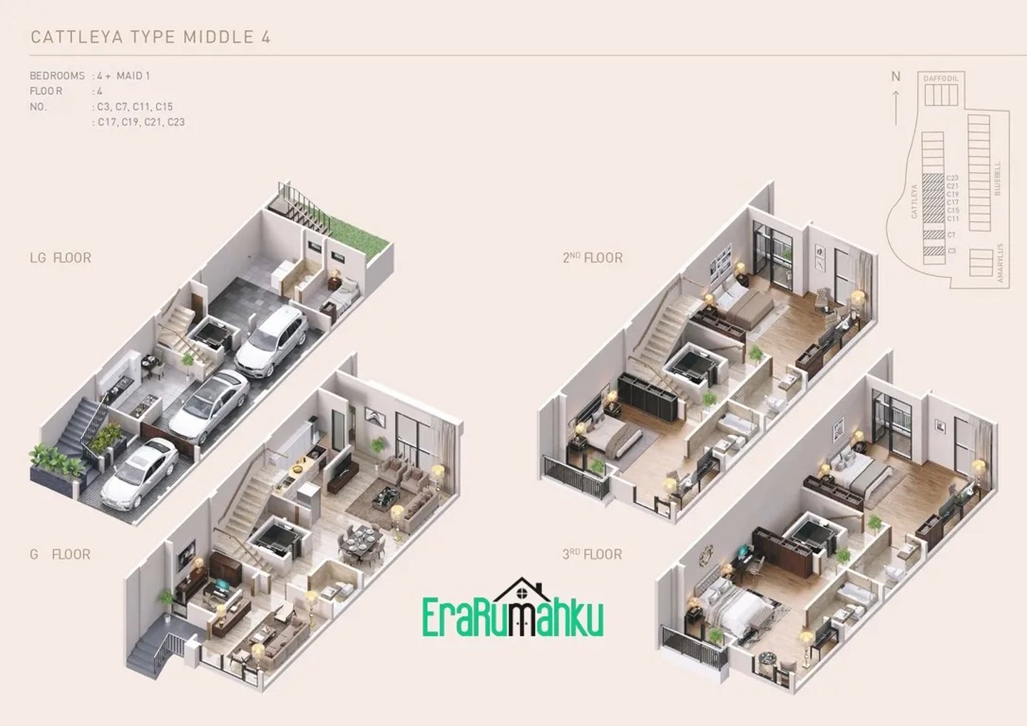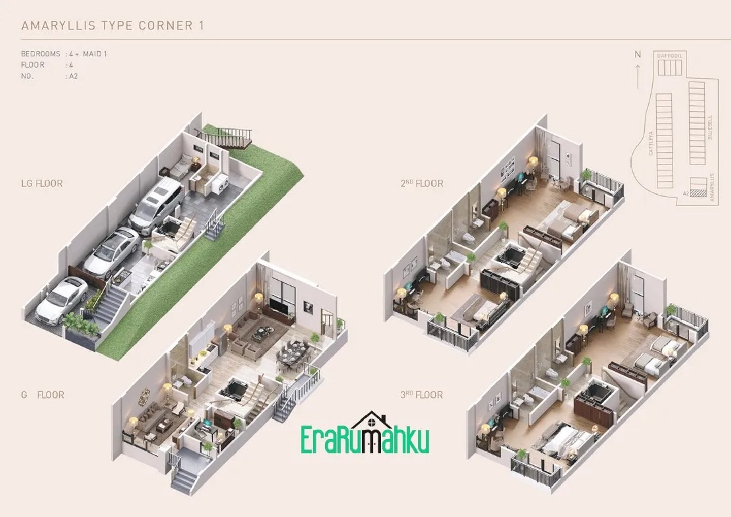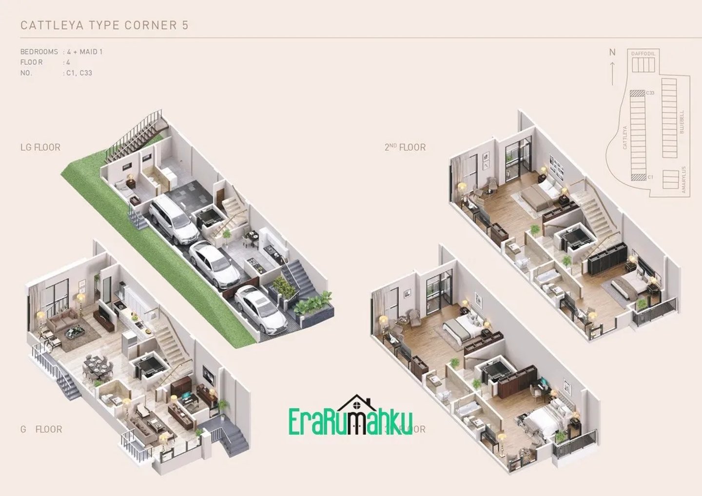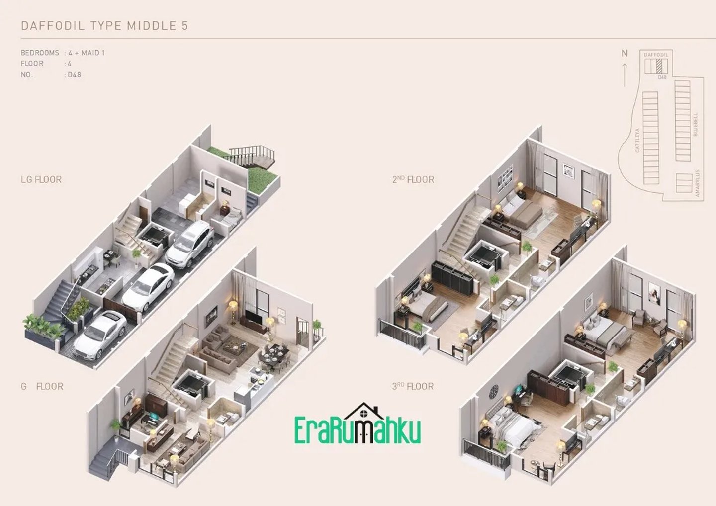 Perumahan ini menawarkan rumah 4 lantai, masing-masing memiliki 5 kamar tidur, 5 kamar mandi, kamar pembantu, dan tempat parkir untuk beberapa kendaraan.