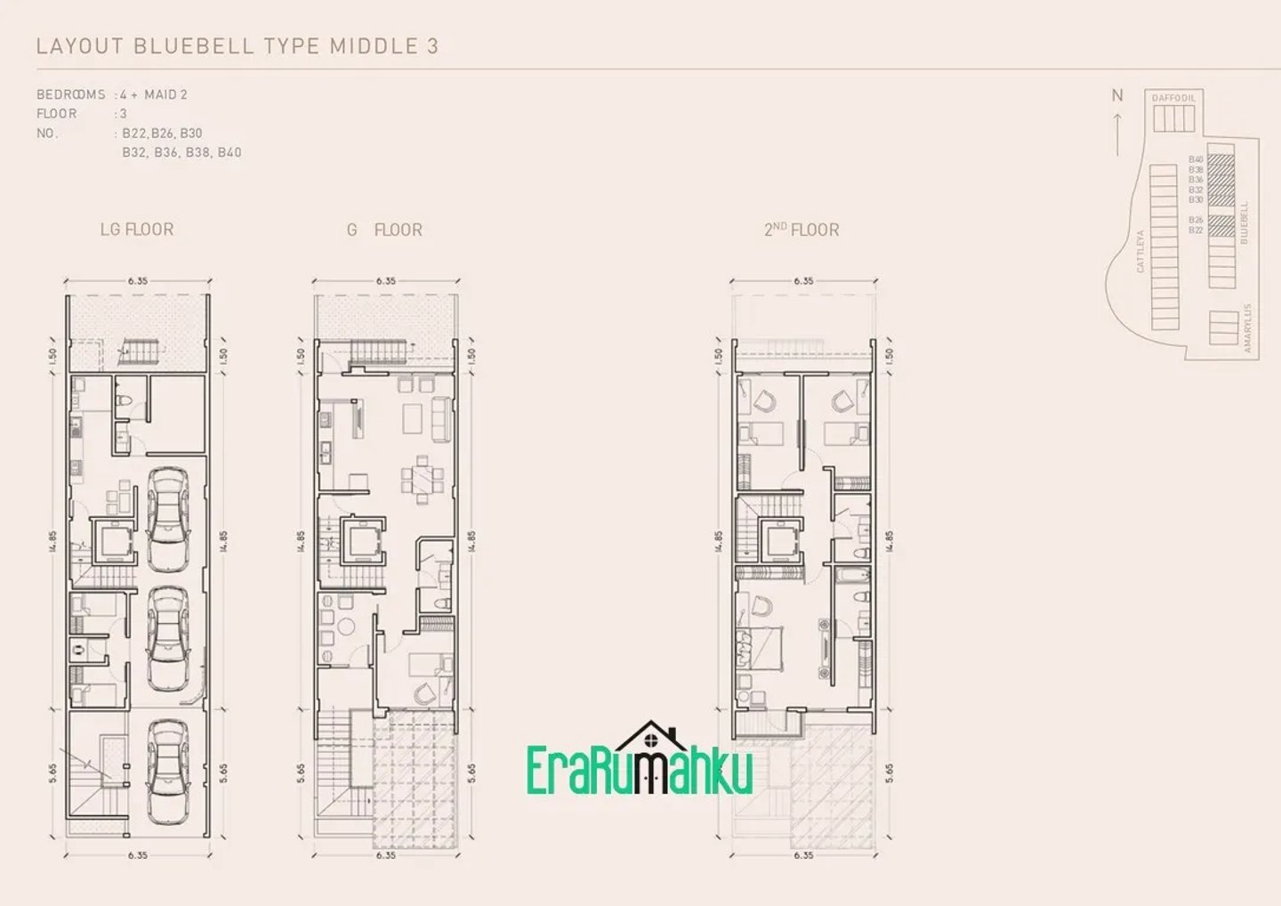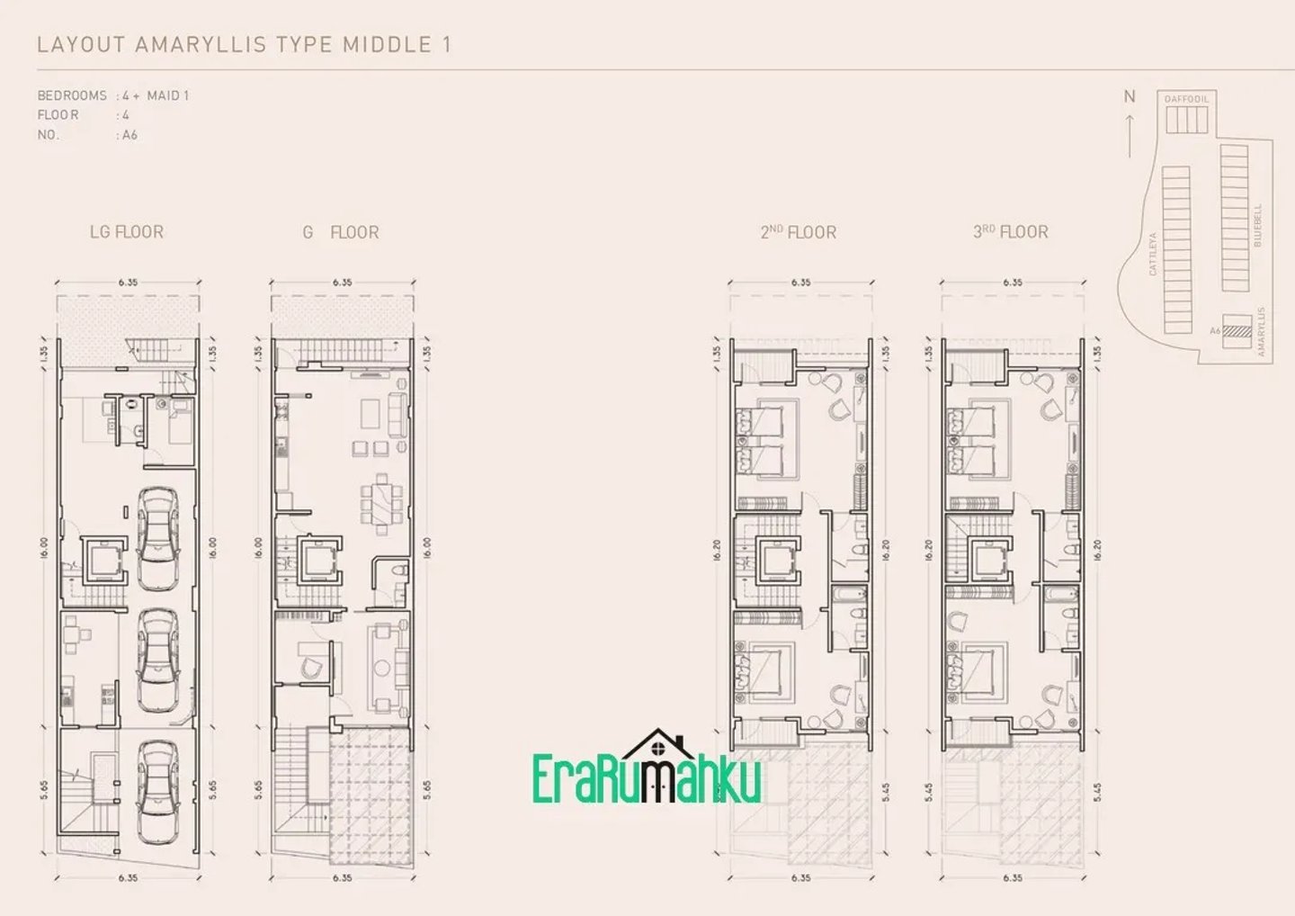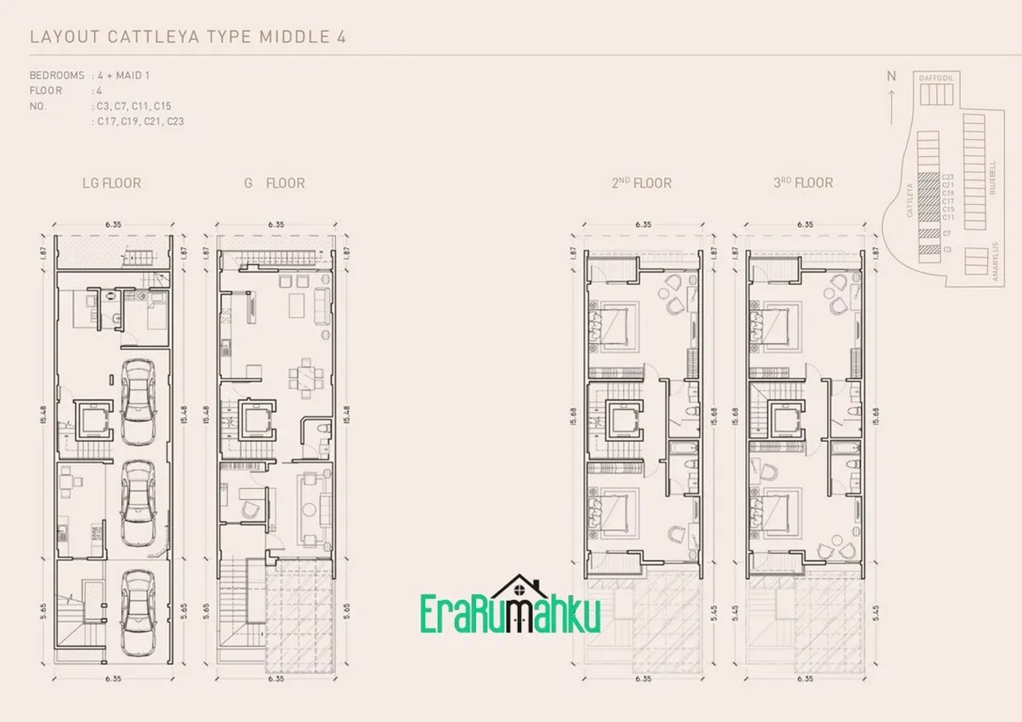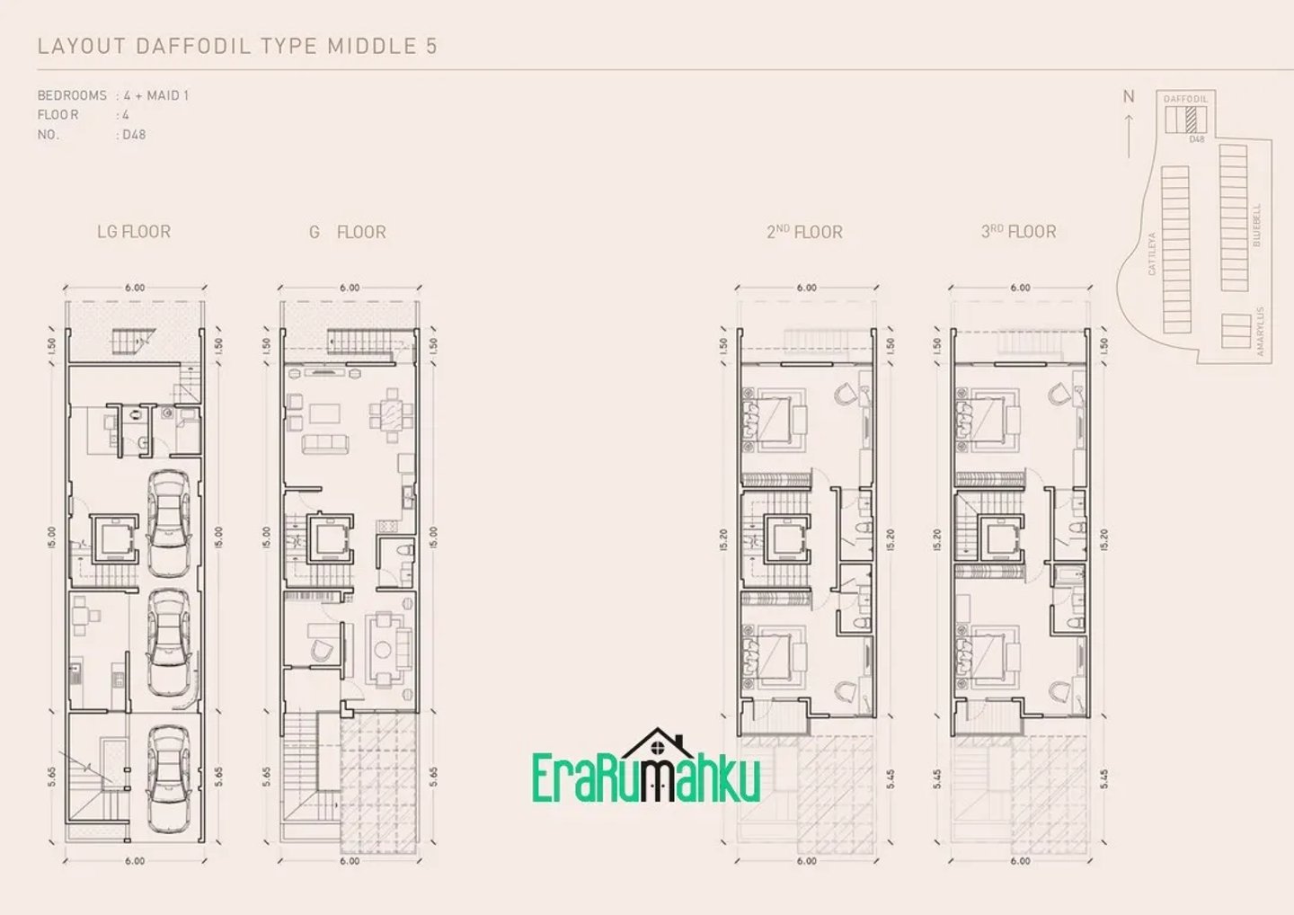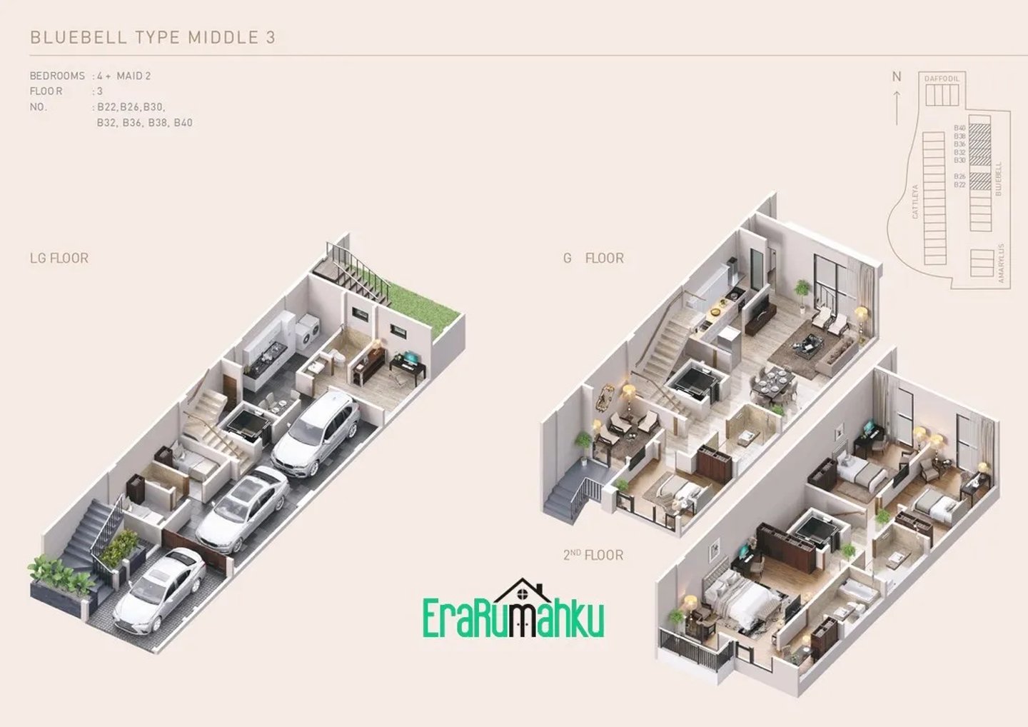 Perumahan ini menawarkan rumah 4 lantai, masing-masing memiliki 5 kamar tidur, 5 kamar mandi, kamar pembantu, dan tempat parkir untuk beberapa kendaraan.