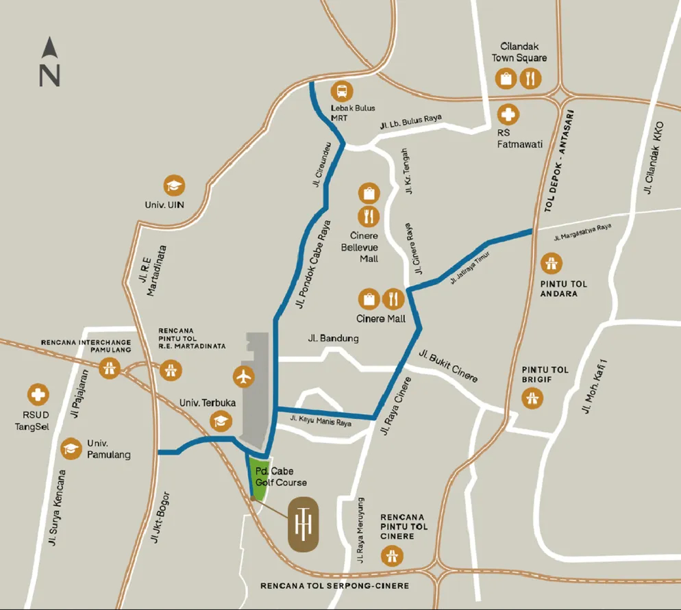 Lokasi strategis The Hills Pondok Cabe menyuguhkan ketenangan sekaligus kepraktisan mobilitas. Hanya 5 menit dari pintu tol R.E. Martadinata, Anda terhubung langsung dengan kawasan Cinere, TB Simatupang, Pondok Indah dan Serpong. Dengan akses tol Depok-Antasari, Cinere-Depok dan Cinere-Jagorawi, Anda selalu dekat dengan kawasan urban, maupun antar kota. Dekat dengan fasilitas kesehatan, pendidikan, gaya hidup maupun perkantoran, The Hills Pondok Cabe merupakan sebuah investasi prima dengan nilai yang akan bertumbuh sejalan dengan waktu.